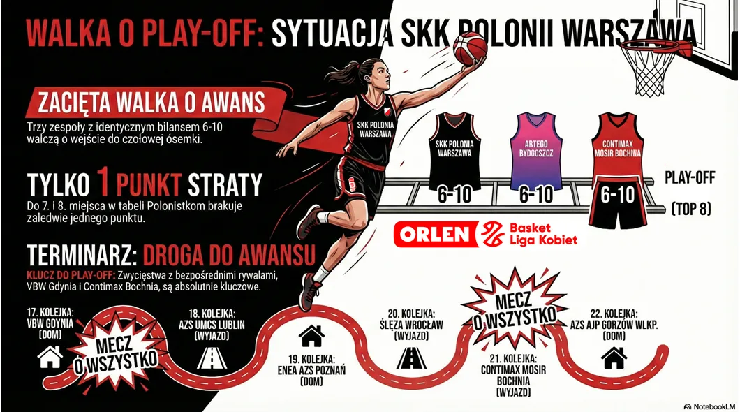W Tabeli 1 przedstawiamy tylko listę meczów, które czekają do końca rundy koszykarki Polonii oraz naszych bezpośrednich rywali do walki o miejsca 7-8, gwarantujące wymarzony awans do fazy play-off.